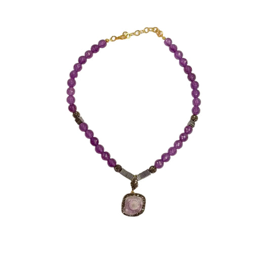 Gold Plated Natural Amethyst Pendant & Beaded Necklace